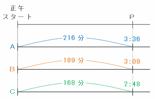 上の図で3人がスタート地点からP地点まで進むのにかかった時間をそれぞれ求めてみると、A君は3時間36分=216分、B君は3時間9分=189分、C君は2時間48分=168分です。