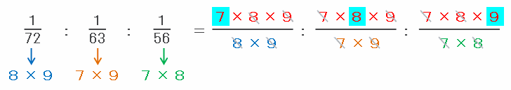 72:63:56の逆比は72分の1:63分の1:56分の1となるのですが、72は8×9、63は7×9、56は7×8と表せるので、3つの分数の分母の最小公倍数は「7×8×9」であることが分かります。