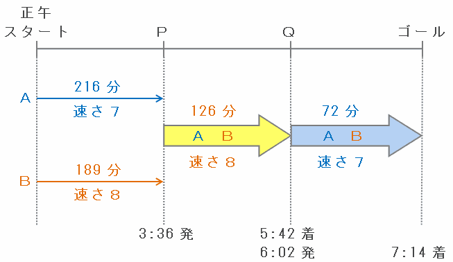 また、2人がPQ間を進むのにかかった時間は5時42分-3時36分=2時間6分=126分、そしてQ地点からゴールまで進むのにかかった時間は7時14分-6時2分=1時間12分=72分です。