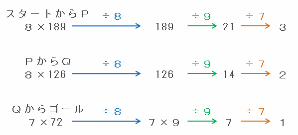 ・8×189→8で割ると189→9で割ると21→7で割ると3