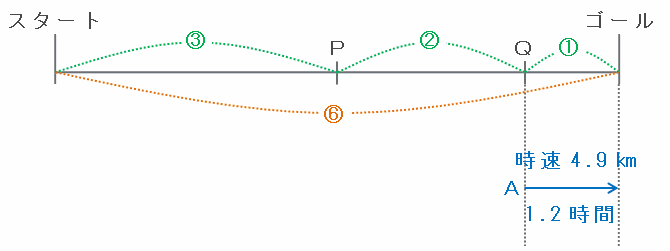 また、A君はQ地点からゴールまでの区間を時速4.9㎞で72分=1.2時間かけて進んだので、Q地点からゴールまでの距離は4.9×1.2=5.88㎞です。