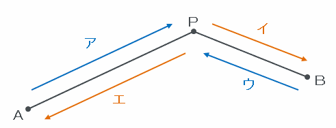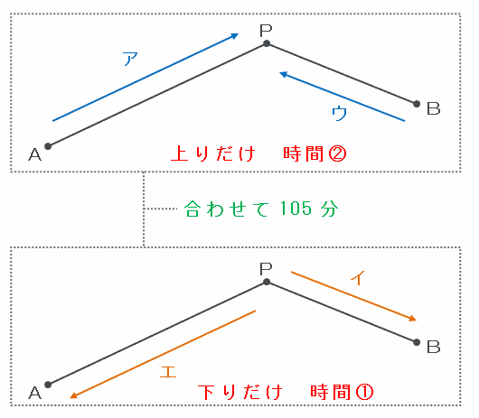 次の図のように「アとウ(上りだけ)」と「イとエ(下りだけ)」の順に進んでもAB間を往復したことになるので、この場合にかかる時間の合計もさっきと同じく105分です。