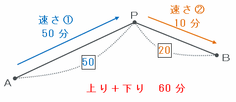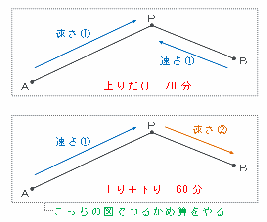 また、普通にAP間を上りの速さ①、PB間を下りの速さ②で進むと60分かかるのですが、上りと下りの2つの速さが混ざっていて、AB間の距離、かかる時間の合計も分かったので、つるかめ算を利用して上りや下りにかかった時間を求めることができます。