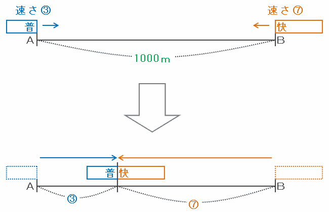 速さの比は同じ時間に進む距離の比と等しいので、普通列車と快速列車が出会うまでに進む距離の比は次の図のように3:7になっています。