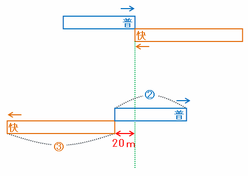 一方、快速列車は③よりも20m多く進んだので「③+20m」と表せます。