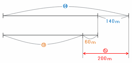 となるので、「⑭-140m」と「⑨+60m」は次の図のように長さが等しくなります。