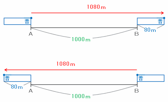 次の図のように、普通列車はAB間を行きと帰りに1000+80=1080mずつ進むので、AB間を12往復したときに進んだ距離は1080×2×12=25920mになります。