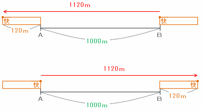 次の図のように、快速列車はBA間を行きと帰りに1000+120=1120mずつ進むので、BA間を1往復したときに進む距離は1120×2=2240mになります。