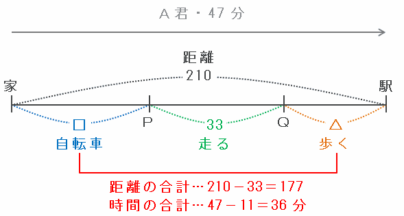 また、家からPまでの距離を□、Qから駅までの距離を△とおくと、□と△の距離の合計は210-33=177、その2区間を進むのにかかった時間の合計は47-11=36分になります(次の図参照)。