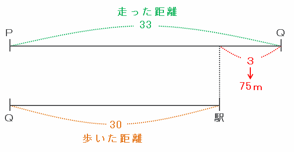 その2つの距離を次のような2本の線分図に表して比べてみると、比の差である33-30=3が、「PからQまで」と「Qから駅まで」との距離の差である75mにあたることが分かります。