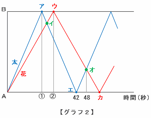 グラフ2の①は太郎君がAB間を片道分だけ進むのにかかる時間を表しているので、①には42÷2=21秒があてはまります。