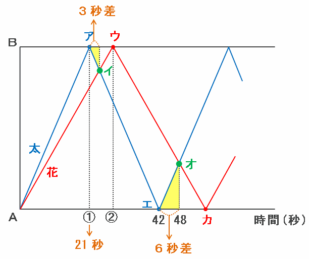 ・ウ→花子さんが初めてBに到着してAへ折り返し(太郎さんはAへ向かう途中)
