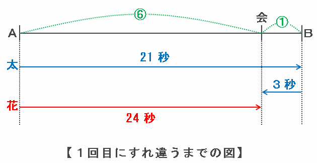 太郎さんはAB間を21秒で進み、折り返して3秒後に花子さんと出会ったので、太郎さんはA地点から出会った地点までを21-3=18秒で進むことが分かります。