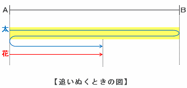 太郎さんが花子さんを初めて追いぬくためには、次の図のように太郎さんが花子さんよりも1往復分だけ多く進めばOKです。