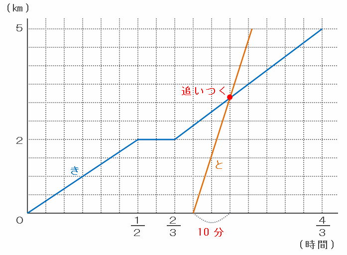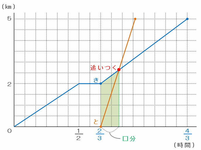 また、ともひさ君はきよし君より40分=3分の2時間遅れてA地点を出発したので、下のグラフのように「0㎞・3分の2時間」と「5分間の休憩の左端」を直線で結べば、ともひさ君が進行する様子が完成します。