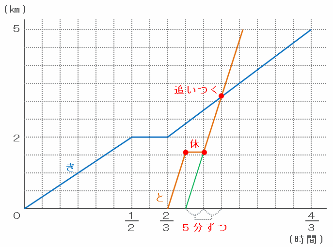 ただし、実際には再スタート後の走行時間は5分なので、次のグラフのようにきよし君に追いついた時刻から5分さかのぼり、そこから線を左へまっすぐ伸ばして5分間の休憩を表します。