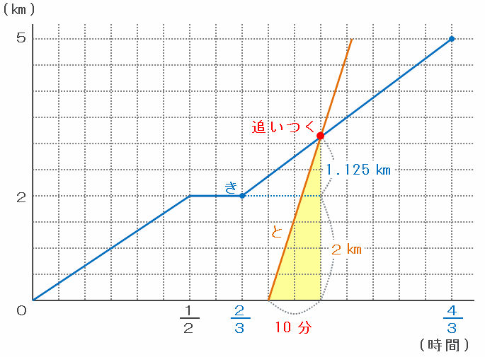 つまり次のグラフのように、ともひさ君がきよし君に追いついたのはA地点から2+1.125=3.125㎞離れた場所であることが分かります。
