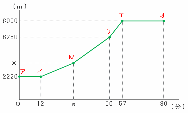 A君はB君よりも速いので、「イからM」のときに比べてグラフの傾きが急になる。「ウからエ」の方がさらにグラフの傾きが急になるのは、ウのときにC君に追い越され、その後はP市からいちばん遠い地点にいるのがC君に代わるからである。