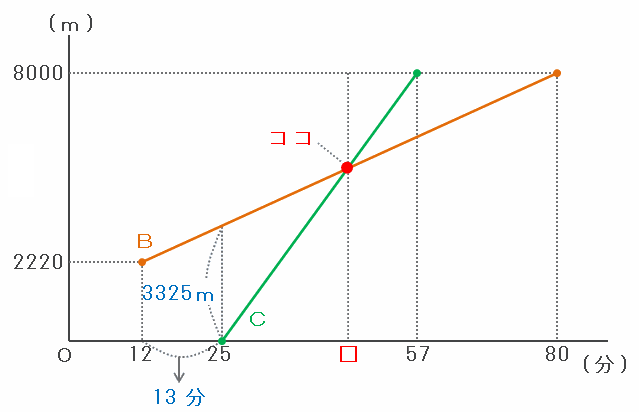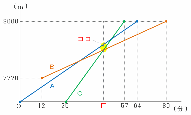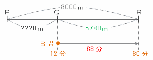 B君はその距離を、グラフの「12分」から「80分」までの80-12=68分かけて進んだので、B君の進む速さは5780÷68=分速85mになります。