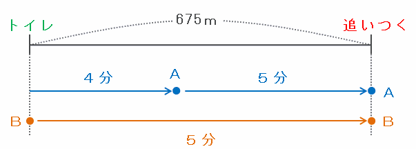 Aがトイレを出発してから675m先の地点でBに追いつかれるまでの流れを次のような図に表してみると、Aが675mを進むのにかかった時間は4+5=9分、Bが675mを進むのにかかった時間は5分なので、