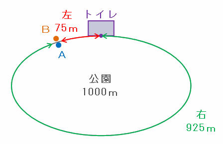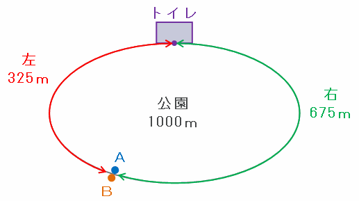 また、BがAに追いついたのはトイレから右回りに675m進んだ地点ですが、このコースは1周1㎞=1000mなので、トイレとの距離は次の図のように1000-675=325mと考えられます。