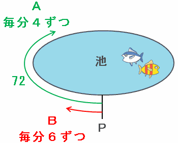 Aは池を2周するのに⑥の時間がかかるので、1周するのにかかる時間は⑥÷2=③と表せます。