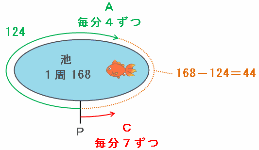 また、CがP地点を出発するまでの18+13=31分間に、Aは4×31=124進むので、Cが出発するときの2人は次の図のように168-124=44離れています。