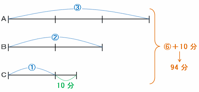 つまり次の図のように、3人が池を1周するのにかかる時間の合計は、③+②+(①+10分)=⑥+10分と表すことができます。
