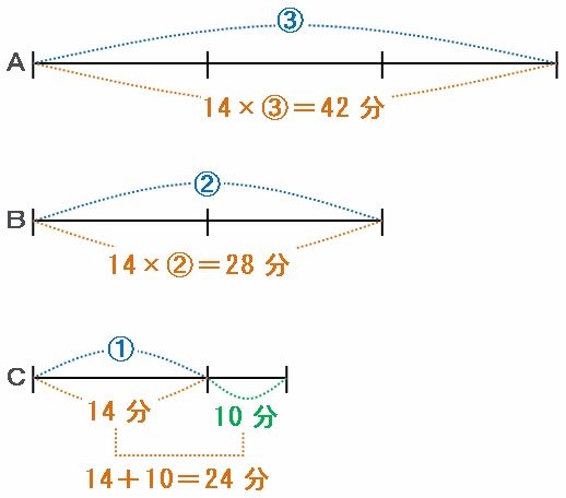 さっきの問題で比の①が14分にあたることが分かったので、次の図のように、Aが池を1周するのにかかる時間は14×③=42分、Bが池を1周するのにかかる時間は14×②=28分になります。