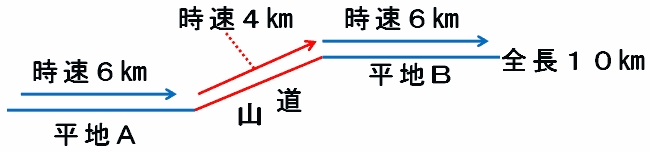 平地Aと平地Bそれぞれの長さは分かっていないのですが、どちらも同じ速度で進むので、大まかにいえばこの徒歩コースは「時速6kmで進む平地」と「時速4kmで進む山道」の2つに分けられます。