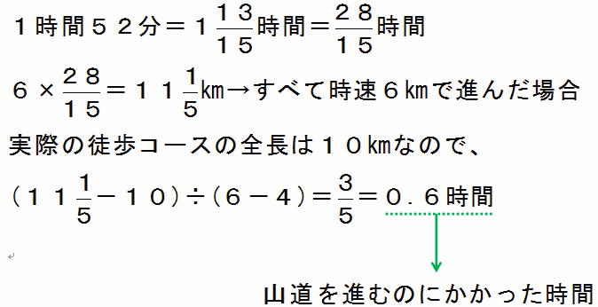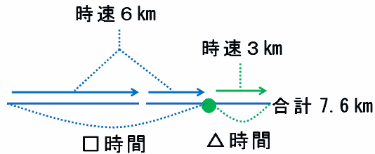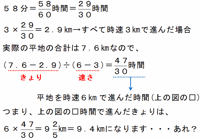 つるかめ算をやったら、時速6kmで進んだ(速さを変える前の)平地は9.4kmになりました。