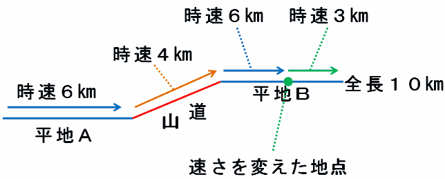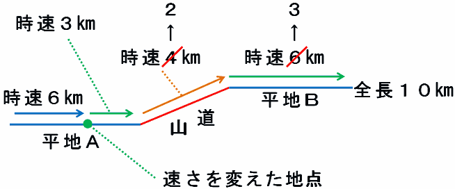 次の図のように、平地Aは途中から時速3km、山道はすべて時速2km、平地Bはすべて時速3kmになります。
