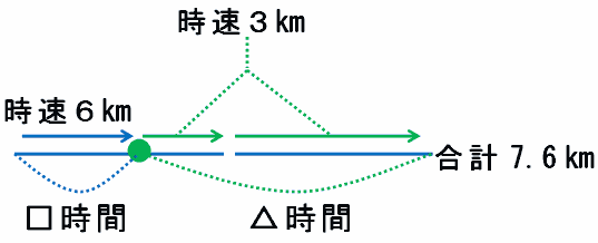 上の図の□時間を求めるために、「1時間34分すべて時速3kmで進んだら」と仮定して、また次の図のようにつるかめ算を行ってみると・・・