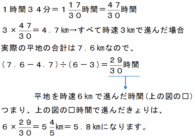 ただし、実際には平地Bで速さを変えた地点の前に山道が2.4kmあるので、出発地点から速さを変えた地点までのきょりは、5.8+2.4=8.2kmになります。