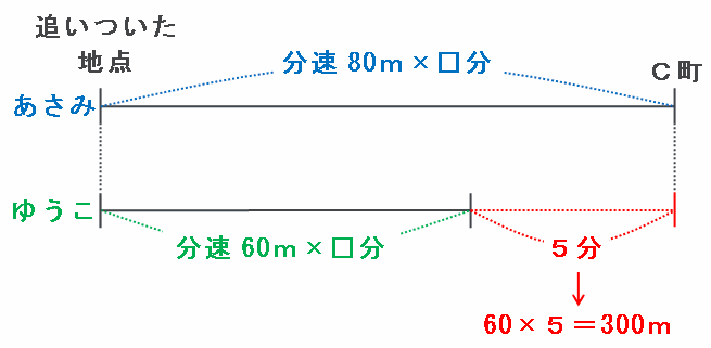 上の図のように、ゆうこさんは5分間で60×5=300m進むので、2人の距離の差が300mになったとき、あさみさんはC町に着いたことが分かります。
