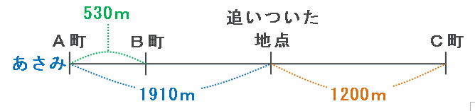 ここまでの流れを次の図のようにまとめると、あさみさんはA町から追いついた地点まで1910m、そこからC町までは1200m進んだので、A町からC町までの距離は1910+1200=3110mになります。