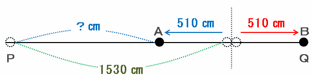 このあと、2つの点はそれぞれ反対方向へ(30+10)÷2=秒速20㎝の速さで進むのですが、2つとも進む速さが同じなので、点BがQ地点までの510㎝を進む間に点AもP地点へ510㎝近づいているはずです。