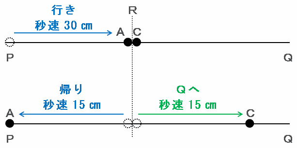 点Aは次の図のように、点CがいるR地点まで秒速30㎝で進み、そこではね返された後はP地点へ向かって30÷2=秒速15㎝で戻ります。