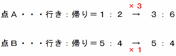 そこで、次のように点Aが行きと帰りにかかった時間の比を3倍して、比の合計をそろえることにします。