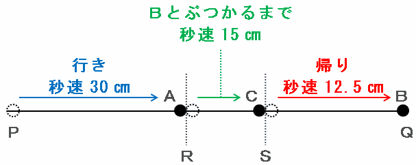 点Bは次の図のように、秒速15㎝で進んできた点CとS地点でぶつかるまで秒速10㎝で進み、そこではね返された後はQ地点へ向かって(15+10)÷2=秒速12.5㎝で戻ります。