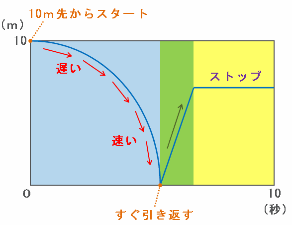 ただし君は10m先からスタート地点へ向けて少しずつ速度を上げながら進んだ。その後、スタート地点に着いてすぐに一定の速さで引き返し、途中の地点でしばらく立ち止まっているうちに、10秒間が経過した。