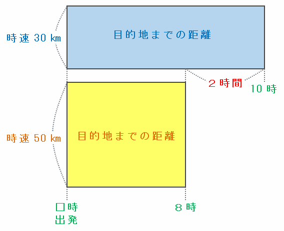 つまり、自宅から目的地まで時速50㎞で進むと3時間かかるので、その距離は50×3=150㎞です。