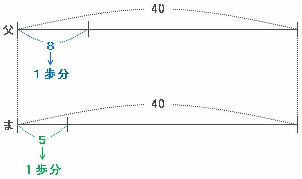 ・お父さん→40のきょりを5歩で進むので、1歩の歩幅は40÷5=8