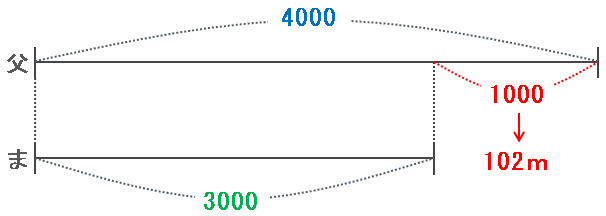 となることから、その差である4000-3000=1000が、次の図のように25分後の距離の差である102mにあたります。