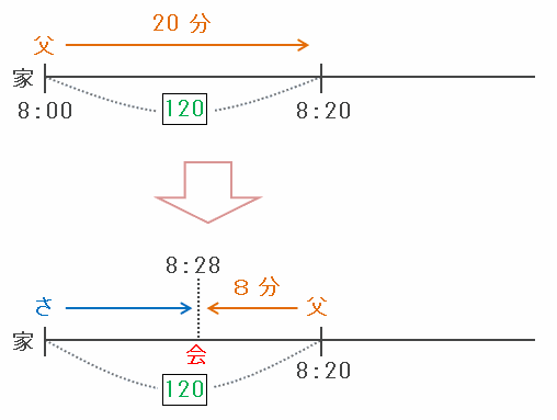 つまり、8時に家を出発したお父さんは、駅へ向って20分間歩いた地点から引き返し始め、さとる君と出会うまでに8分かかったので、2人が出会った時刻は8時+20分+8分=午前8時28分になります。