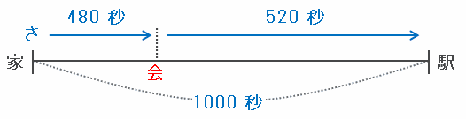 家を出発したさとし君がお父さんと出会うまでにかかった時間は8分=480秒、その地点から同じ速さで駅まで進むのにかかる時間は8分40秒=520秒なので、さとし君が家から駅まで走って進むのにかかる時間は、次の図のように480+520=1000秒です。