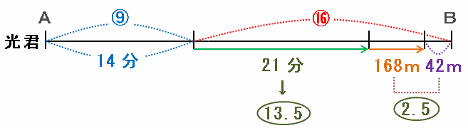 実際には、光君は進む速さを毎分8mアップさせているので、その分でさらに8×21=168m進めたのですが、それでもB地点までまだ42m残っていました。