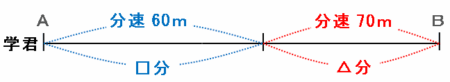 学君も最初は分速60mで進んでいたのですが、途中から60+10=分速70mに変えた結果、聖君よりも1分早い35-1=34分間でAB間を進みました。