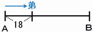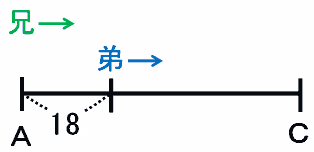弟が進む速さは比の8なので、兄がA地点を出発するまでの2分15秒=2.25分間に、8×2.25=18のきょりを進みました(図1)。