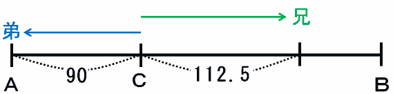 その間も兄はB地点へ向けて10の速さで進み続けているので、弟がA地点へ戻ったときには、B地点へ向けて10×11.25=112.5のきょりを進みました(図3)。